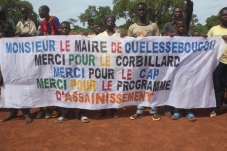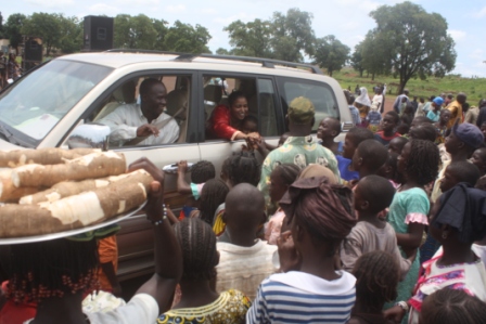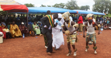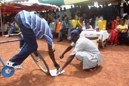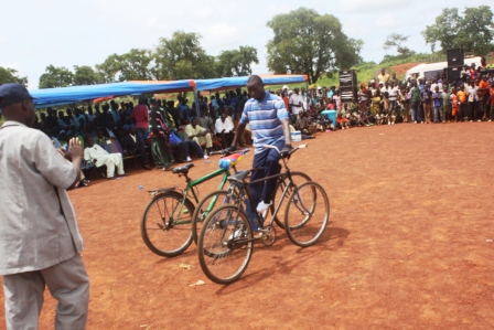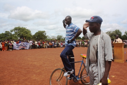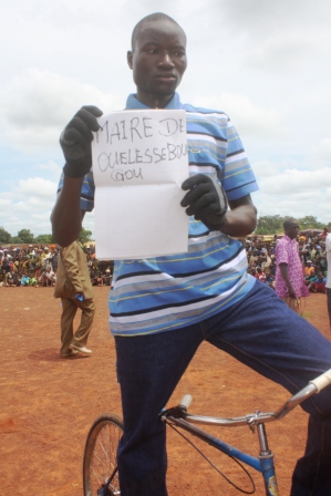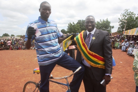 As with any good Malian party, it would not be complete without a griot singing. Yeah broke protocol and joined the drummers in a dance. As a mayor this is not a common sight but the people of Ouelessebougou loved it! Then came the major entertainment of the morning. A young bicyclist proved great prowess as he cycled three bicycles (that’s right, I said three), backwards( yes, backwards)!! This trick was followed by multiple balancing tricks that my dear Keanen just loved. Carmen kept hoping he would fall off his bike.:)