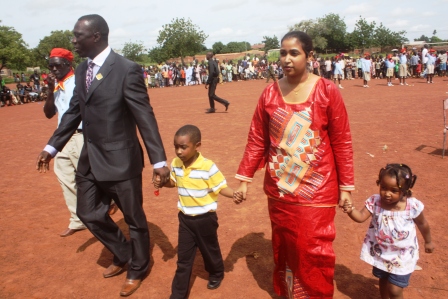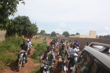 The next day, the festivities took a more solemn turn similar to speeches that an American president might give. The celebration was slated to start at 9am “sharp” and like all good Malian celebrations started a good hour later. We were accompanied in style by a host of 30 motorcycles that beeped in our welcome. This was a sight to see and even my normally noise sensitive children got into the swing of things.